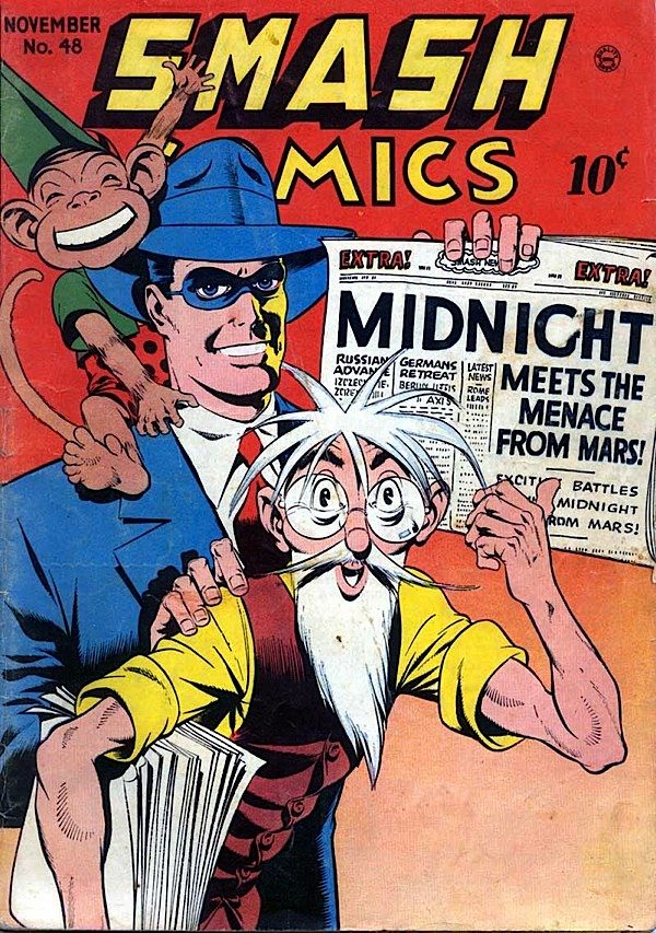 Actually, no. The publisher of the syndicate whipped up Midnight when the Spirit’s creator, Will Eisner, was drafted for WW2. He was intended as a backup in case Eisner died and took the rights to the character down to the grave. Midnight was a dead-ringer, but had a few differences – he hung around with Doc Wackey, who looks like a Grandpa character kicked off the Timbertoes, and the Spirit's faithful companion Ebony White, an embarassing racial caricature, was transmuted into a monkey. Which is worse.