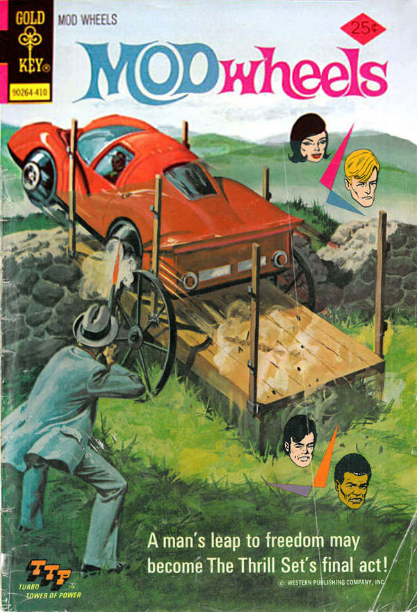 It's a bit difficult to tell what's going on, but I'll try. The Thrill Set, who may or may not be connected in a professional fashion with the Turbo Tower of Power, consist of four people, one of whom is a recently defrosted Nazi who wasn't happy to learn Germany lost the war. Wasn't happy at all. One of these individuals has decided to escape from a farm, which is ringed in its entirety by a stone fence. The only way to get over the fence was to build a ramp - in this case a dock with a gunrack, dragged from the lakeshore a mile away. The dock didn't intersect the ground at the proper angle, though; there was a gap of a foot, which meant the car would strike it head on, its momentum stalled. Someone said: no problem, man, we'll just engage anti-gravity to life up the front! And then everyone was like, oh, right, that's cool.