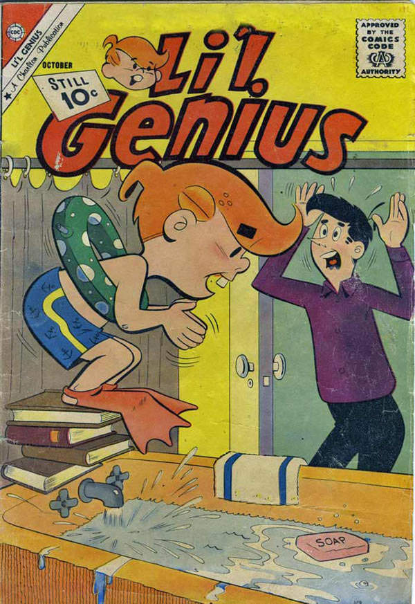 Another lousy Dennis the Menace rip-off. The baby-boom spawned a number of comics about mischievous squat destructive boys without the ability to govern their impulses, but this knock-off was particularly obvious. I don’t know what’s going on with his hair; looks like he has a dyed peanut tucked behind his ear.