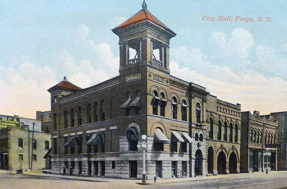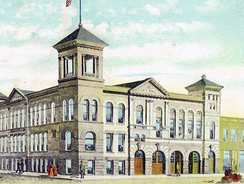 This page has a picture of the City Hall built right after the fire. It's obviously the right portion of the psotcard drawing, with two wide doors and a narrow one . . . and a tower. But when you compare that to the picture above, it seems they chopped off the tower, built the narrow door on the other side of the building, THEN built the new part? Or did it all at once? No pediment, in any case. And no real front door. Makes my head ache.