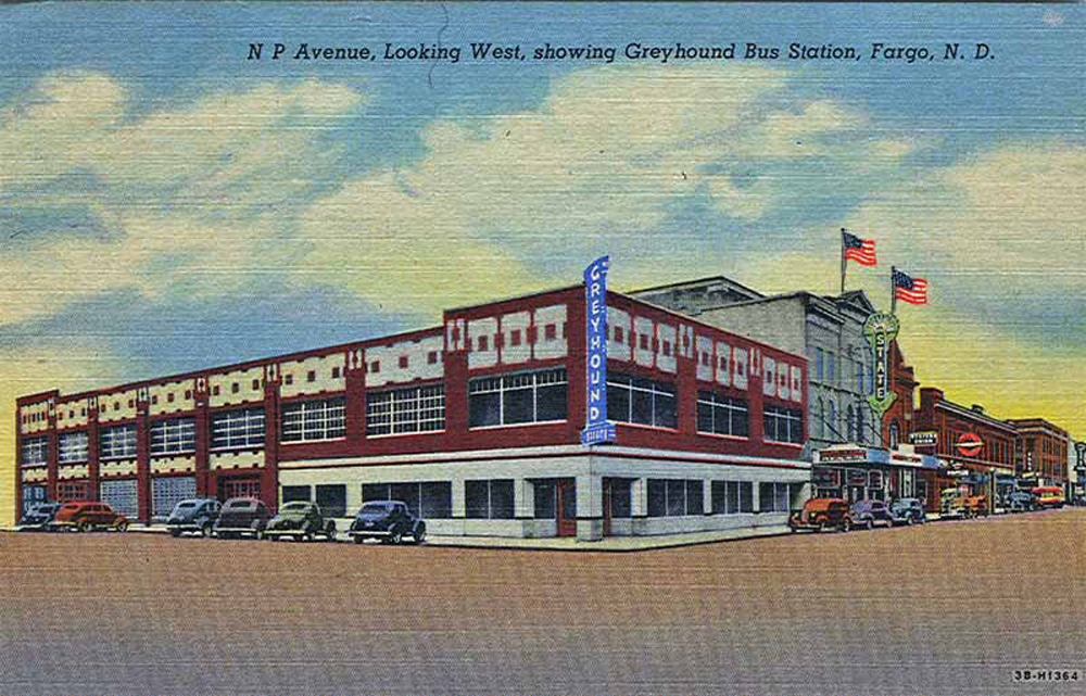 Many cities got sleek Moderne bus stations from the Greyhound empire. Fargo, it seems, did not. According to NDSU, it was an auto garage for a while, then a bus station for some other lines, and finally a Greyhound station in 1942.