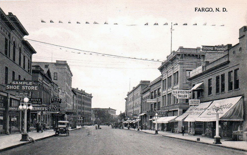 Stone Piano's building went up in 1910. Mr. Stone was doing okay if he could afford three floors. Hard times in the 30s meant selling out the band instrument department to a fellow named . . . Daveau, and that's why those of us who geew up in Fargo in the 60s and 70s knew this building as Daveau's, and wondered why it said STONE atop the cornice.