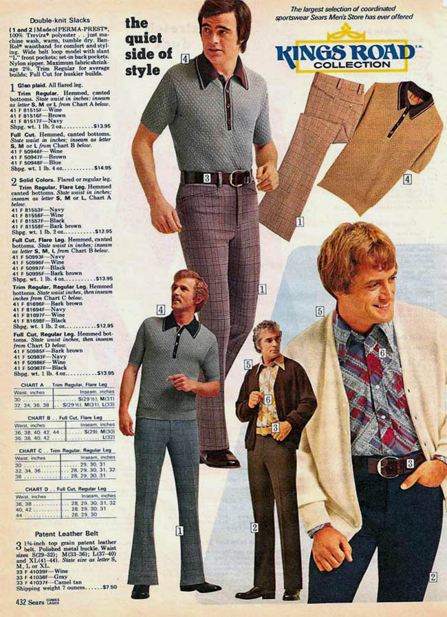 The Quiet Side of Style! Quiet as an unhushed 707 jet whose starboard engine just inhaled a box of nails. On the top: Johnny from the gas station steps out for Bison Meat Night at the Masonic Lodge. Bottom left to right: porn-star formal wear, rakish rich-man around-the-house slither-wear, and finally, an ensemble to knock ‘em dead at the semi-annual Roger Daltrey Appreciation Society banquet.