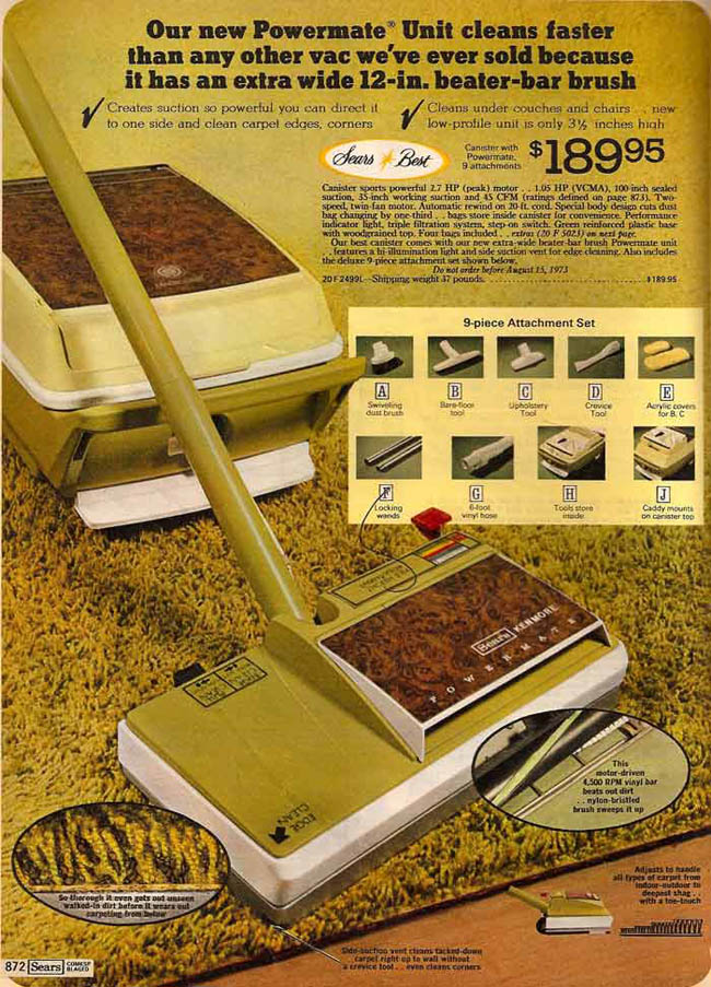 One detail makes it a true inhabitant of the world of 1973: Wood-grained Plastic, for that elegant touch. As I've said before, the only thing for which wood-grained plastic is appropriate is the casket of the man who invented wood-grained plastic. And note the price on this sucker: In modern dollars, that's about $440. But it has a "two-speed motor," for those times when you just want to scare the dust and move it around a little. Maybe herd it around for later. |