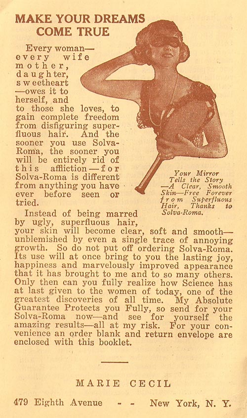 You owe it to the people you love to be free of hair - but of course you will love to walk around the house gazing into a mirror, your pits on display, wearing a mask because you have hideous ghastly hair called "eyebrows" and you used Solva-Roma to remove them, and then you applied false ones with paint, but you had an allergic reaction! You had scales! Hateful, ugly scales! Your children wil run away screaming! Your husband will turn away, his face a tangle of competing emotions, from disgust to rage to hatred to a grim, bitter hatred of the Church whose strictures keep him tied forever to your disfigured self! Like it's any skin off the Pope's nose if you leave! Like he knows what it's like to live with a woman whose coarse leg-nubs can be felt through her thick woolen nightgown! The disgust flows up his throat like bile!