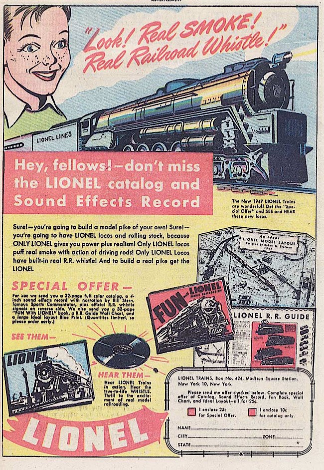 God-like, the lidless lipstick’d lad hovers over the train, transfixed. You got a lot for a quarter - a record, a poster, a layout, and a Fun Book. I always wanted one of these; always wanted trains, with detailed towns and mountain passes and tunnels and whoo-wooo whistles. Sure - you're going to walk to build a model pike of your own, but you'll give it up when it doesn't look like anything in the catalogs, won't you? Sure! |