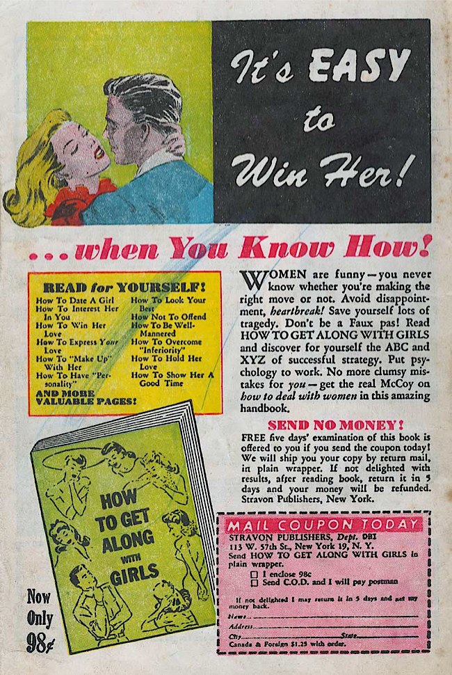 Don't be a Fox Paz! You could find these ads in the comic books aimed at older types, pimply mouth-breathers with pale, pasty skin who read the "Crime" and "Horror" books with a peculiar shine in their eyes. These ads were irritating, in a way - they implied that you could get girls if you knew the secrets, when that wasn't always true because they were all stuck-up and went for guys who looked like the one in in the picture HE DIDN'T NEED ANY HELP NOW DID HE
