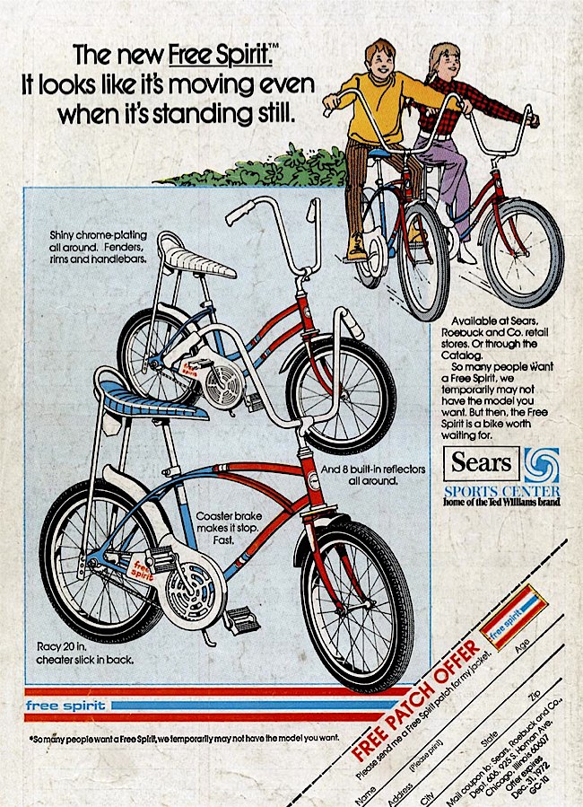 It's the seventies: the bike you want may not be available, due to shortages. Ths fact has to be mentioned twice. And since it's the middle of the seventies - Bicentennial time! - the bike's all-American red, white, and blue. And because it's the seventies, the trailing edge of the sixties, the point where the vocabulary of the counterculture had been fully co-opted by the marketing execs, the bike is a Free Spirit. |