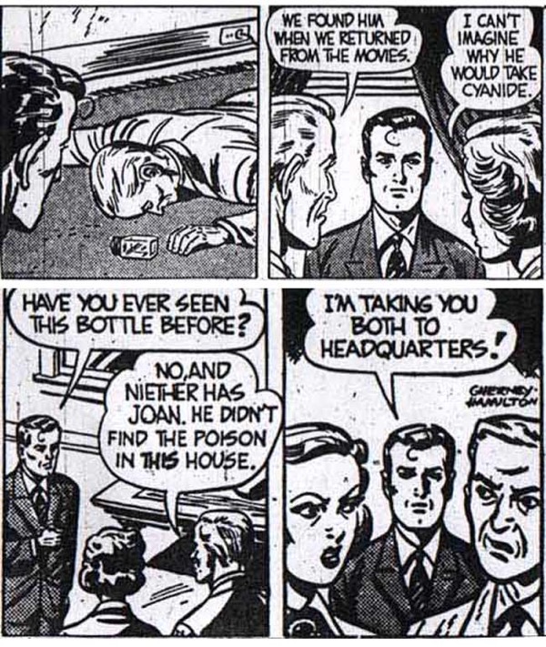 “Three wrong answers. One, ‘Black Angel’ didn’t play tonight. I figured that would be your alibi when you said you went to the movies, so I called the theater down the street from your house - the Grand - to see what they had playing. The paper says they’re playing ‘Black Angel,’ but that’s a misprint. Last night was the last night. Now, that one alone is going to get you hung. Then you called this character Tom, then Tim, which suggests to me that he’s neither, and you’re not the common-law wife of anyone except perhaps the lip of a gin bottle. Third: cyanide smells like almonds. And here you are chomping down an Almond Delight. Going to look bad for the jury. Cold-blooded and all that.”