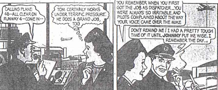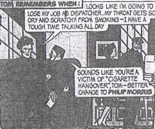 On one hand, it’s as commonplace an exchange as you’ll find: a smoker who needs his voice for his job recalls the day he switched brands. But this fellow is different: if his expression in the last panel is any indication, he’s completely out of his mind. He’s a little TOO happy about this subject, and he also seems to be wearing a good deal of eyebrow makeup-. But it gets worse.