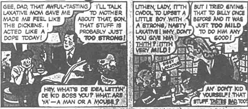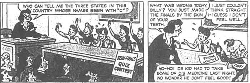 This ad campaign from the early 50s gives us the Laxies, three stool-hastening imps of varying tempers. Here we meet Tuffy, an Brooklyn-based imp who has not only scoured Billy’s innards, but accompanied him to school. |