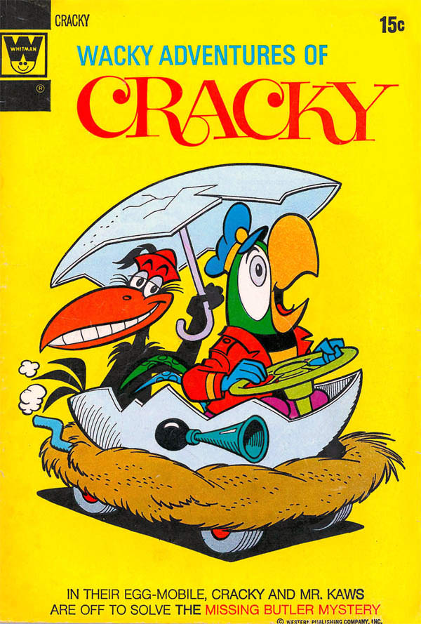 | Cracky was the mascot for "Golden Magazine," a late 60s kids mag put out by Western. They also made Little Golden Books, which featured all your favorite TV pals in dreadfullly illustrated adventures. Cracky drives around an Egg-Mobile, just the way humans like to travel in amniotic sacs.  |