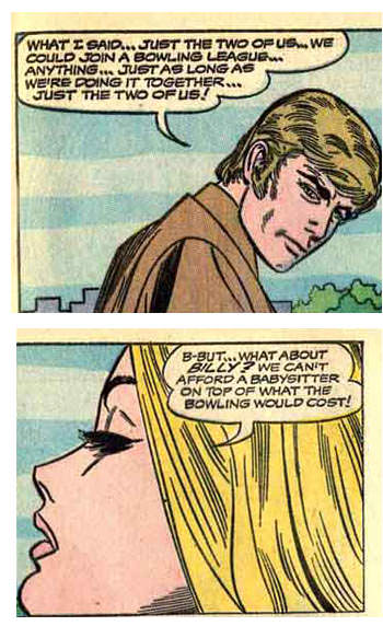 The actual story isn’t too far off from the cover. These two used to go together, but she fell in love with his best friend, and married him. Both guys went off to ‘Nam, and served together until the guy who married the blonde was shot by Charlie. With me so far? Well, the guy who’d been dumped romances the young widow after he’s back in the world, and she re-falls in love with him and marries him. But it’s rocky, because the baby cries like ALL THE TIME, and he can’t get any action. Desperate to carve out some private space, he stakes it all on a picnic where he’ll put forth the one brilliant idea that might save their marriage: BOWLING.