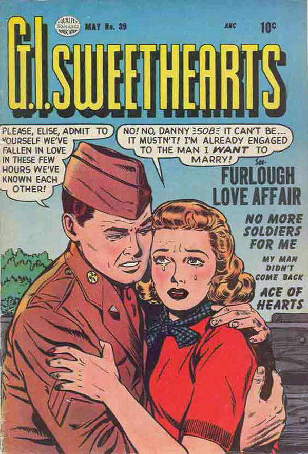 How this Furlough Love Affair ended, we don’t know – but note how the very next story swears off enlisted men again. Perhaps this was an attempt to attract readers who were either in love with a GI, wanted to be in love with a GI, or just got over a GI and wanted someone nice who didn’t wake screaming. Really, it must have been hard and all and Korea was cold, he said, but – oh, look! Here comes that fella the girls call the Ace of Hearts! How’s my hair? |