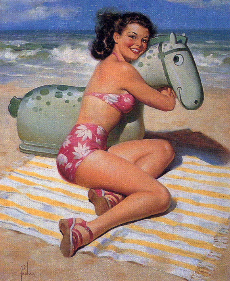 What is that thing? That’s when you realize that this not only is Art, it could only be Art. He did more than the underwear-dropping series, it seems. He was one of the few cheesecake artists to introduce a peculiar element into racy paintings: