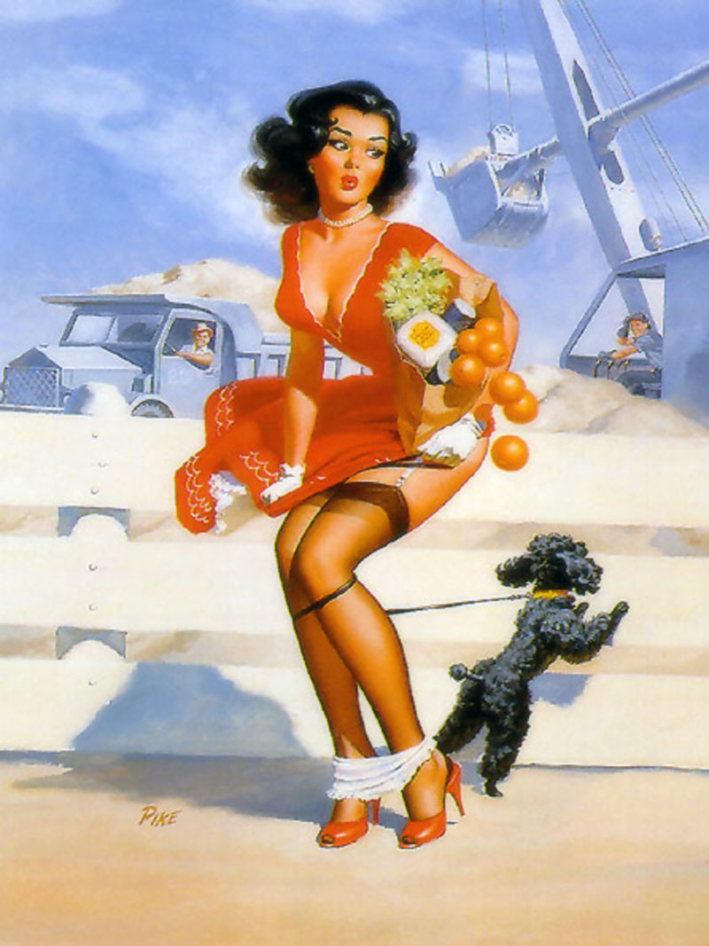 When the A. Fox calendar company needed an artist to complete the last two years of the Art Frahm "panties-falling-down" series, they turned to Jay Scott Pike. Among the memorable images he created for Fox are a gas station scene and, as the last in this important series, featured a brunette and her dog outside a construction site is entitled "Dog Tied".