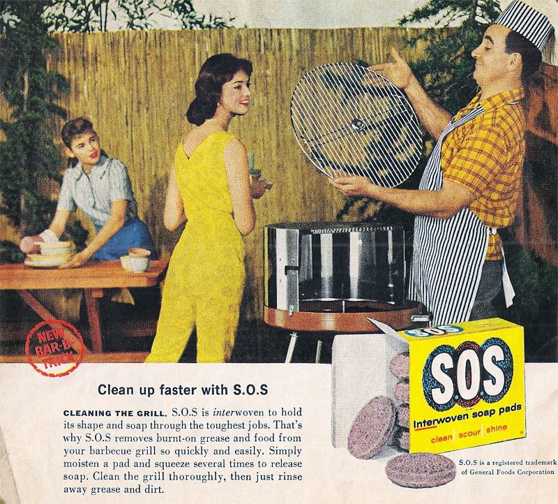 Okay, so SOS is interwoven. Noted. They seem quite proud of the fact, even though you have no idea what it means. Dad’s pretty happy about it all, even though he has no idea that the grill is now picking up transmissions from Sputnik and reflecting them into his head. Wife’s happy, too, although she appears to be some sort of chameleon bred to blend in with SOS boxes and squeeze-bottles of French’s mustard. Daughter is incredulous as well, but happy no one is looking at her deformed right hand, which is not only elongated but ends at the wrist.