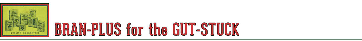 As you may have surmised from the title of this section, this booklet concerns the wonderful effects of bran. According to the book, Depression-era foods are often bran-minus (see also shavings, gravel) and thus need a bran-boost to provide you and your family with dense & dependable defecation. Let’s take a look at how it works, shall we? |