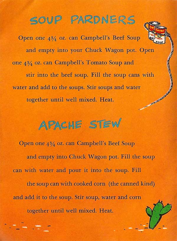 As for the complex, subtle delights of Apache Stew: Heaven forfend you would use fresh corn. I don't know if Campbell made canned cord; I think not. This may have been an act of solidarity with the Canning-American community. |