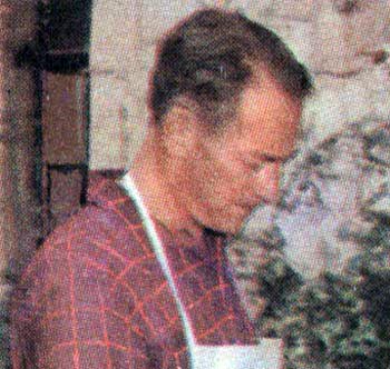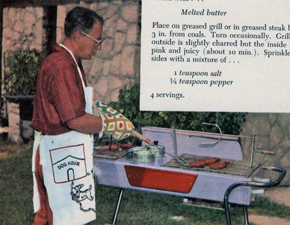 This one has it all - the best grill, the mismatched gloves, the novelty apron, the faux-brick house, the snappy clothes . . . HEY, WAIT A MINUTE! Now we know why that one fellow was so peevish.
