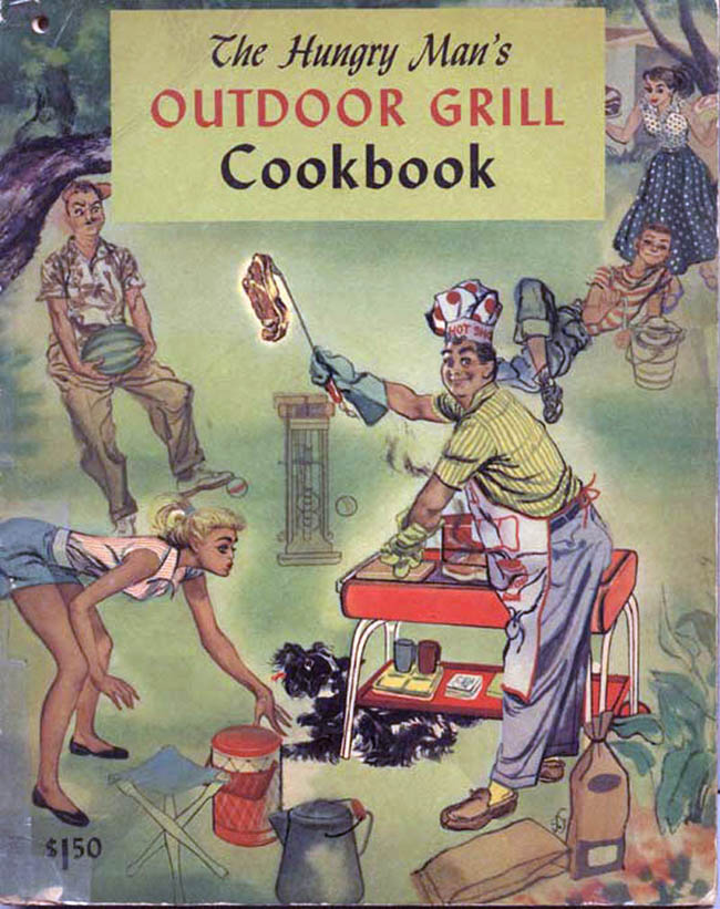 The chef is a cheerful, jolly old soul, holding aloft a perfect steak - hand-dipped in phosphorous and triple-dipped in plutonium, the modern way! See how it glows! |