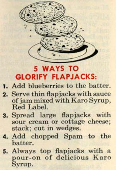 Back to flapjacks. This may seem curious to modern eyes, but in the Olden Days the word “glorify” was middle-America breezy slang for “improve.” It connoted “jazziness” without any actual jazz involved.