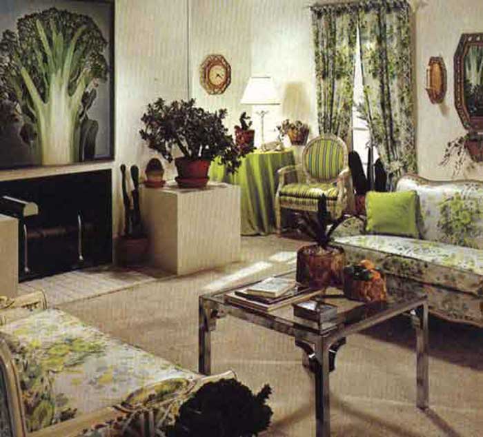 Here we have a mix of old green crap, new green crap and some stunning green transitional crap, all of which serve to give the room the exhausted, mealy flavor of overcooked vegetables. The owner has picked the most unattractive variety of cacti available - the ones that look like prickly billy clubs - and placed them by the fire, where they are certain to ignite, setting the rest of the house on fire within minutes.