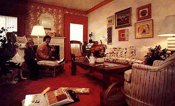 Its sad, really. We all want to hold our parents in respect and admiration - and while Ive no doubt this woman was a lovely mother, heres the proof that she had rather banal taste in home furnishings. The sofas dont match, theres inordinately ornate wallpaper over the fireplace, the colors are oppressive . . .