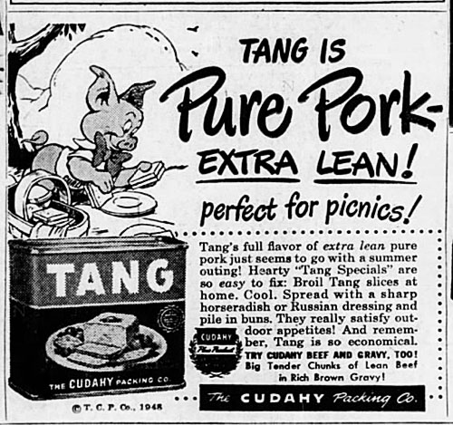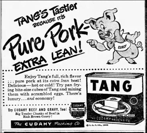 |  | Cudahay Curly Frankly - or hotdogly, if you wish - Curly's a disturbed individual. Cudahy Curly, a Pig, pushed one product: pig. He shilled for Tang, a Spam-knockoff; for bacon, pork chops, and another iteration of his slaughtered comrades.  It's not unusual to see chickens advertising dead chicken meat, or cows happily hawking ground-beef specials. But Cudahy Curly brought an unnatural zeal to the job. You can detect in some mascots a trace of ambivalence, or forced humor, but with Cudahy Curly, it was all you could do to keep him from jumping on the soapbox and demanding that more pigs be killed for his entertainment.  A cross between Richard Simmons and Jeffrey Dahmer.    |
