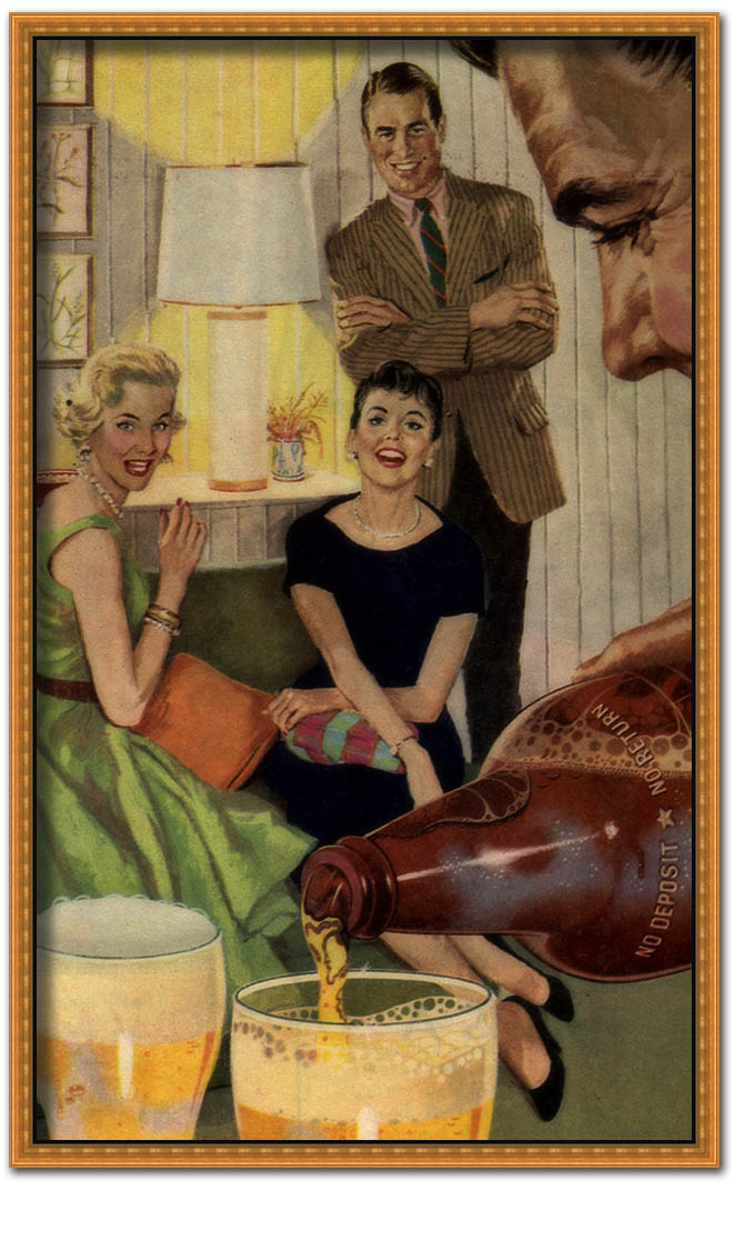 We assume this work was one of a series that revealed the Mystery of the Party Quarts, a term we know only from the advertisements. The fellow in the foreground, with whom the viewer is supposed to identify, is pouring the sacramental lager into two glasses, not three. The man in the back may possibly consume a different beverage - a Seven and a Seven, perhaps - and then there will be sexual intercourse intended to repopulate the world.