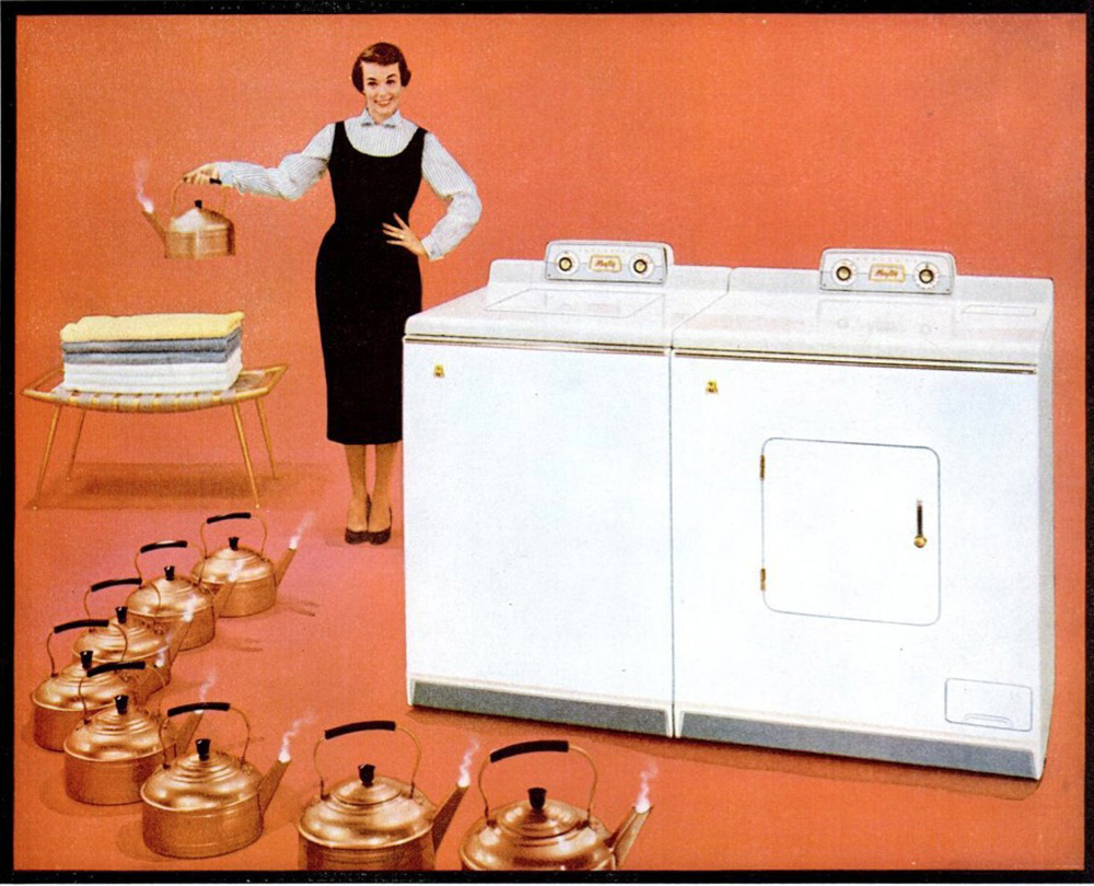 We know little about the Copper Kettle Cult aside from its obvious prominence, but this work suggests a funeral rite. The machine on the right accepts the body of the dead; the machine on the left, which has no door, symbolizes its ascention to the next plane. The position of the Kettle held by a Perky Vestal over the garments suggests they are being purified for wearing in the next world.