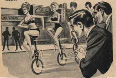 Given the tenor of this mag, I wouldn’t be surprised if this was some new live shooting gallery Vegas had invented. Throw your drink at the unicyclists. Knock one down, you hear a loud DING! Knock six down, win a prize. |