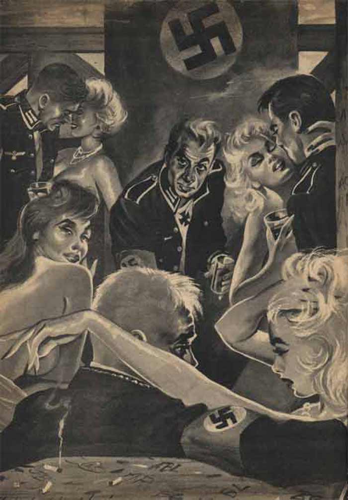 “For 2 weeks the 3 young American teachers, on a vacation in London, behaved like harlots in order to find out what Plans the Nazis had Hatched to take over England.” You have to love that Fritz in the middle, looking at us with an expression that either says “I know you’re going to beat us, and I am grimly resolved to the fact, and it’s just my luck I don’t even get a member of the Harlot-Educator Community to salve my pain” or “I am the artist, and I really enjoy looking in the mirror then painting myself as a fascist debaucher.”