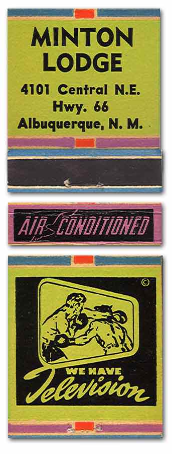 "We Have Television" - the equivalent of today's "Free Wi-Fi" signs. The Minton was a small motor court on Route 66; an old postcard image can be found here. Satellite photos indicate a motel-shaped business at the site, but it appears to be gone now.
