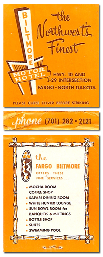 The Fargo Biltmore offered not only fine services and a great sign, but a hint of Tiki with an unintelliible shield design.