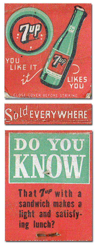 I found a batch of 7-Up matchbooks. Not for a second did I think "I'll have to rip up the site so they can all go together with the others," because that would require pointless labor, and we're just here to browse. Do you know I'm not that compulsive about these things?