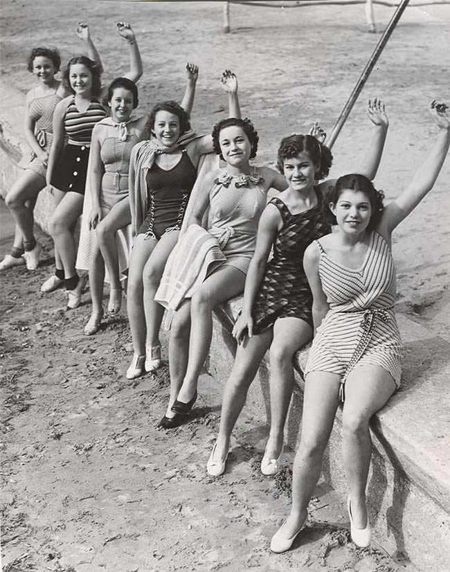 “LONG BEACH, CALIF – Pretty mermaids – left to right; Marie Stone; Betty Ryan; Vida Lee Peterson; Elizabeth Stubblefield, Beverly Bingham; Betty Avery and Joyce McIntosh, display what the well dressed bathing girl will wear during 1937. They are pictured at a preview showing at Long Beach.”