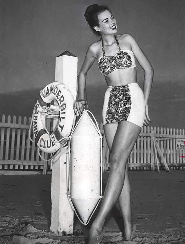 She poses by the old-style cast-iron life preserver, which the California llifeguards threw to people stupid enough to get themselves into trouble. Threw at them, actually. Knocked them out, and they drowned.