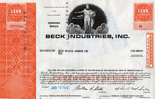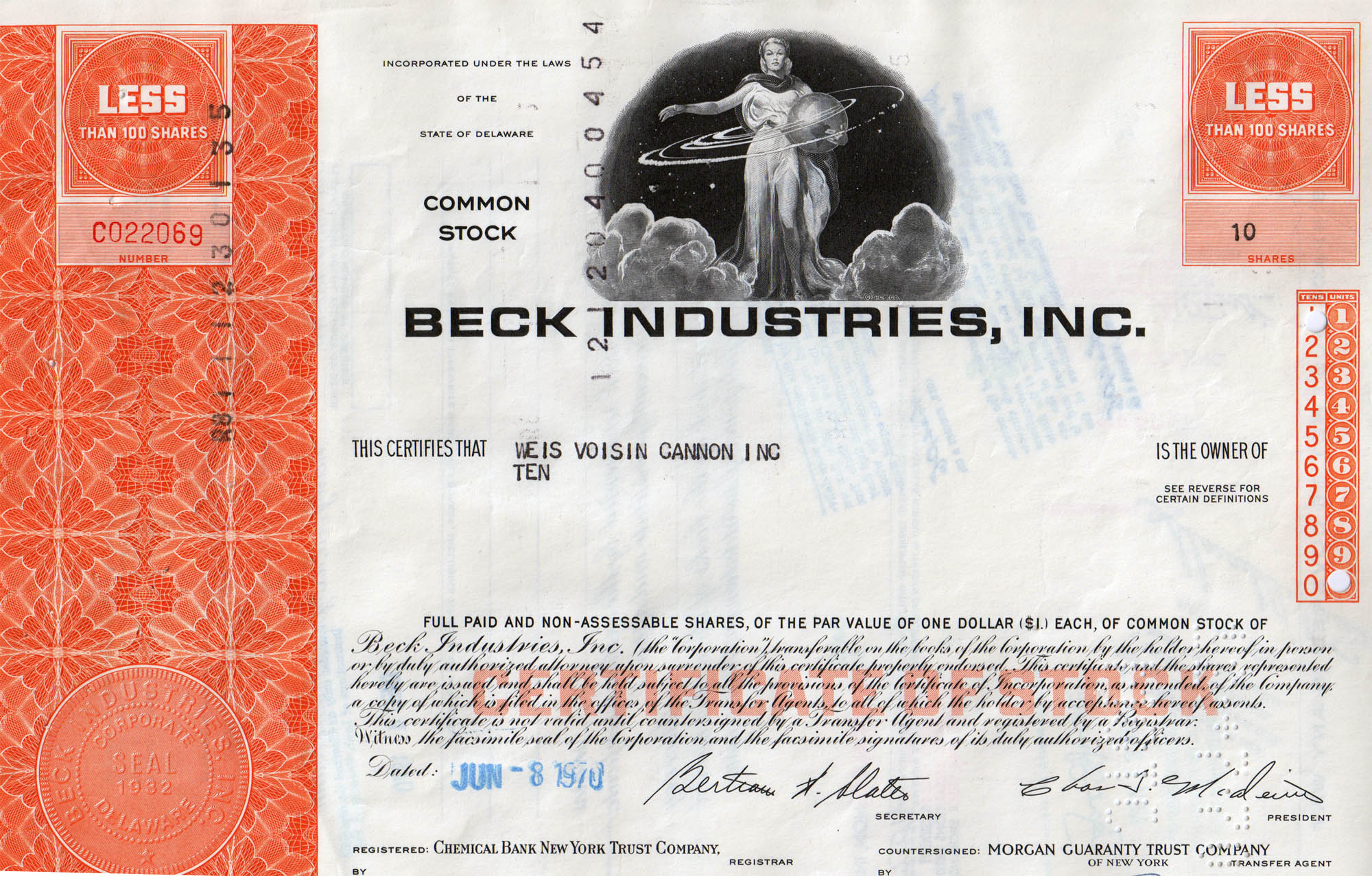 Beck Industries? Nothing comes up, at least nothing large enough to justify a stock sale. But who knows. Shulton, which issued the stock on the previous page, made private-label soap - including Old Spice. If you’re going out on a day with her, I’d recommend against it. She’s over it by now.