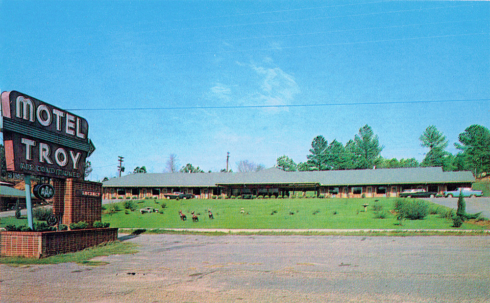 "Spacious Lobby" is just one of the attributes of "Troy's motel of distinction." I can't find any indication it still exists. The address says it was 2 miles north of Troy, but that's not helpful. Measured from the center of town? The outskirts?