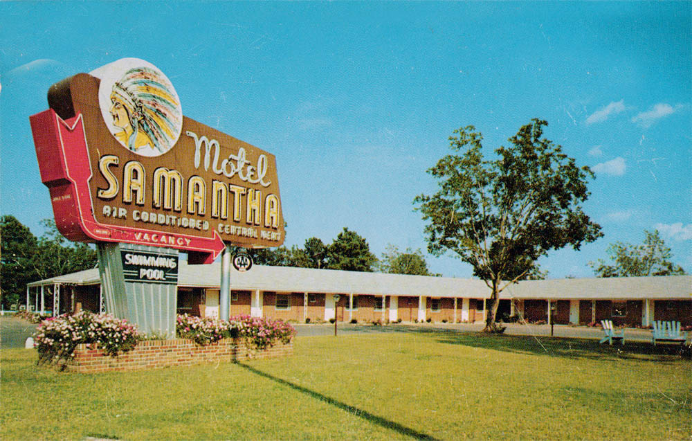 The Samantha boasted “Every Modern Convenience,” which of course is preposterous. Univac computers in every room! No. But it did have a pool and a HoJo restaurant next door, and a long tall pole that lined up perfectly with the sign’s support post at a certain hour of the day. Folks from all over would drive to see it align, just so. That was the sign it was time to have a refreshing beverage of a spirituous nature, perhaps. Men would stagger home at sunset, and their wives would ask “Have you been pole-syncin’ down at the Samantha agin?” they’d nod yes, sheepishly. |