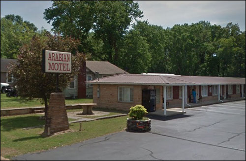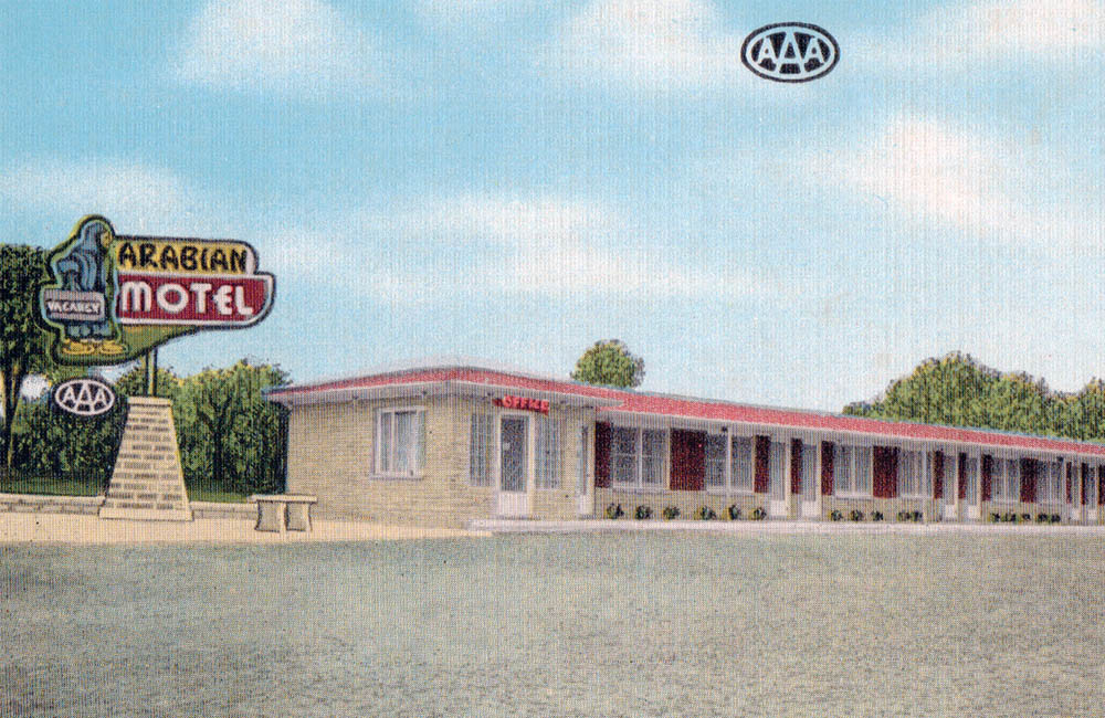 The sign looks drawn, but it’s probably just retouching. The Arabian is located in Arab, which is pronounced AY-rab. Seriously: as Wikipedia says, “The name of the city is pronounced "AY-rab" and was an unintentional misspelling by the US Postal Service, in 1882, of the city's intended name, taken from the son, Arad Thompson, of founder Stephen Tuttle Thompson.”