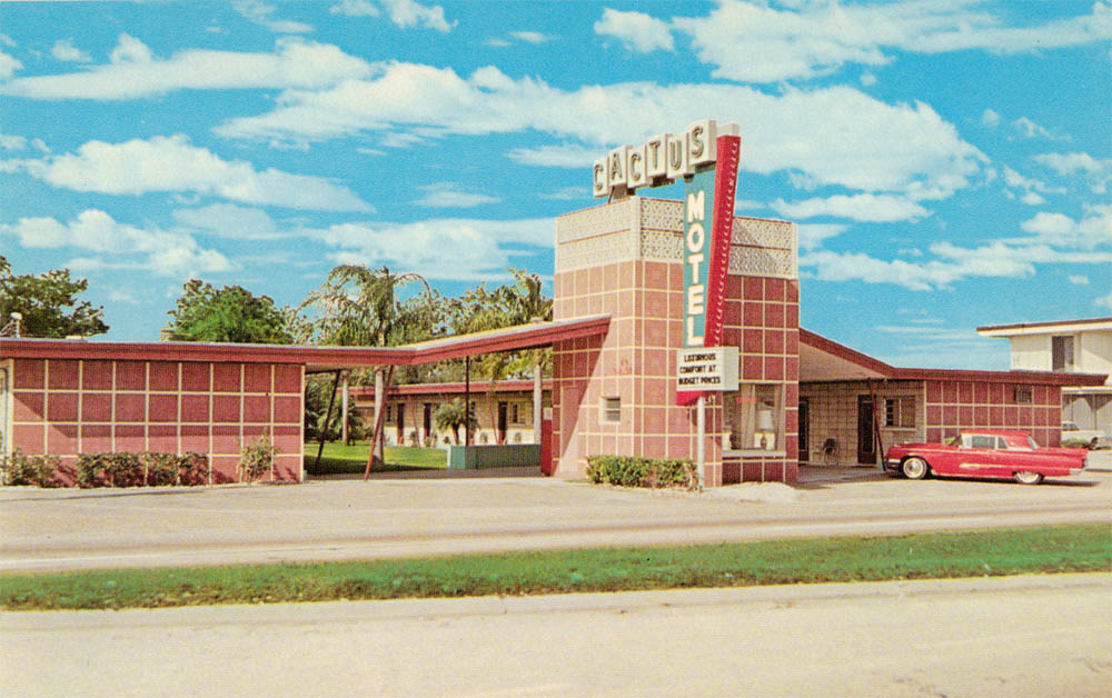 What - a - fabulous building. Cheap to build, too - just cement blocks, probably. The card lists few attributes: AC, TV, Electric Heat. No pool. Who cares? Just sit across the street and look at it.