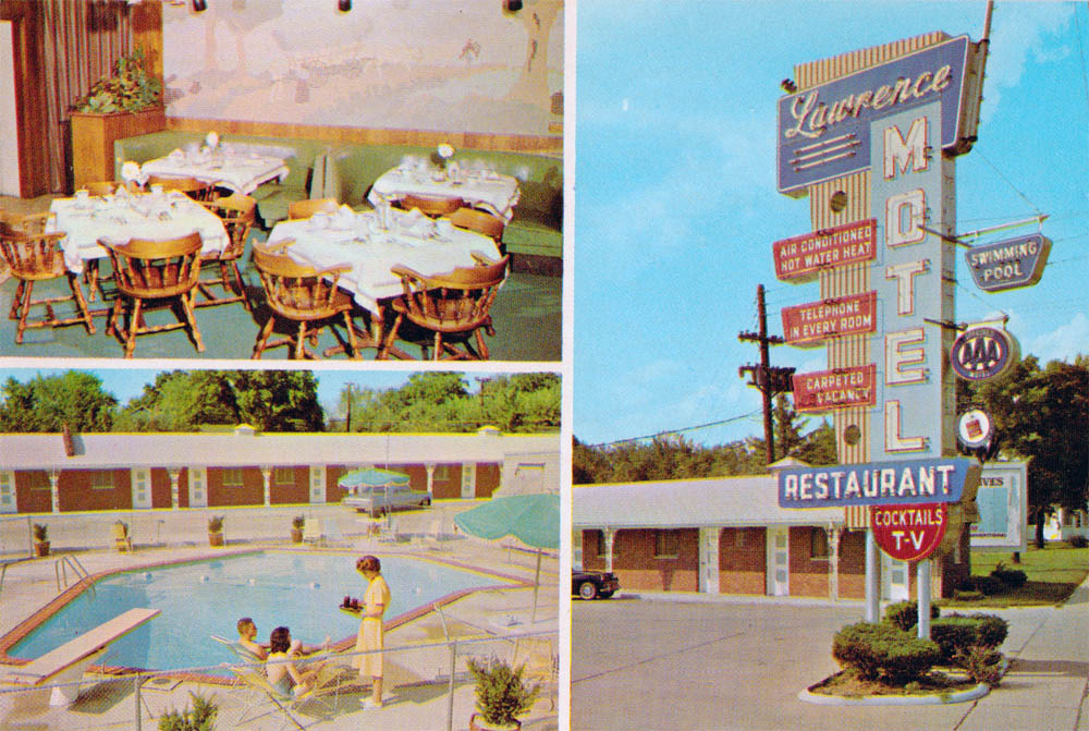 There’s more flair hanging off that sign than the buttons on a TGIF suspender. Still, it has a certain stolid 50s flair. Cocktail lounge, restaurant, room service, and of course "carpeted vacancy." Lots of amenities for a 44 room joint. in the days before the Holiday Inn, places like these covered all the bases.