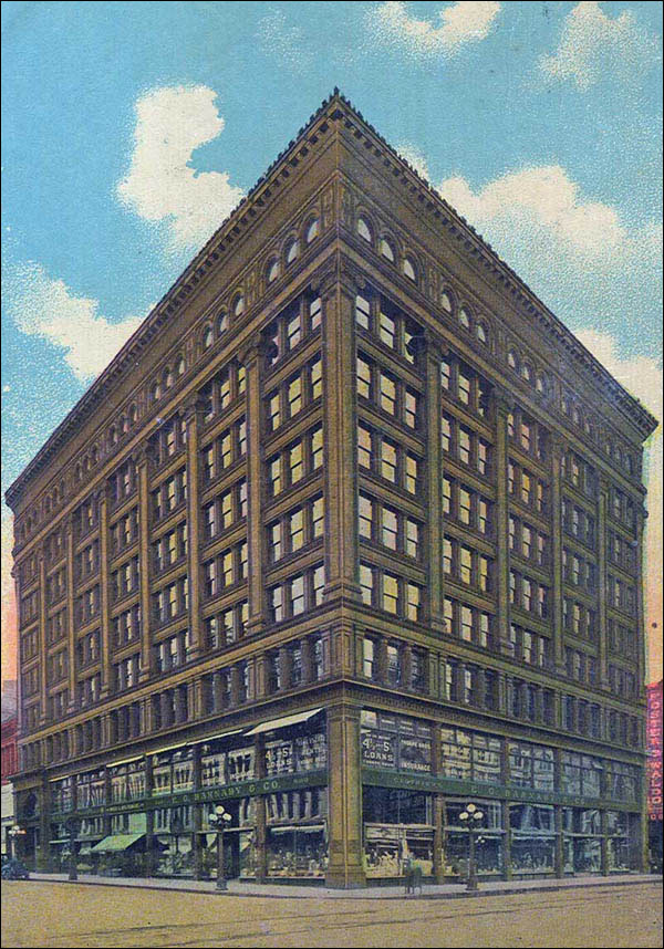 Another postcard view, and it’s a bit more prosaic; the clutter of commerce and company names fills up the lower floors. E. G. Barnaby held down the corner.