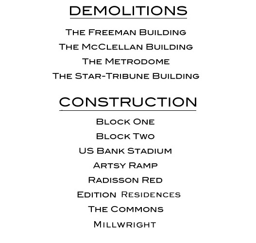 Welcome: it's an unofficial account of the fall and rise of the largest urban renewal project downtown Minneapolis has seen in years. It required the demolition of one ugly 80s office tower, the historic StarTribune building, an unloved old warehouse, and the storied Metrodome.