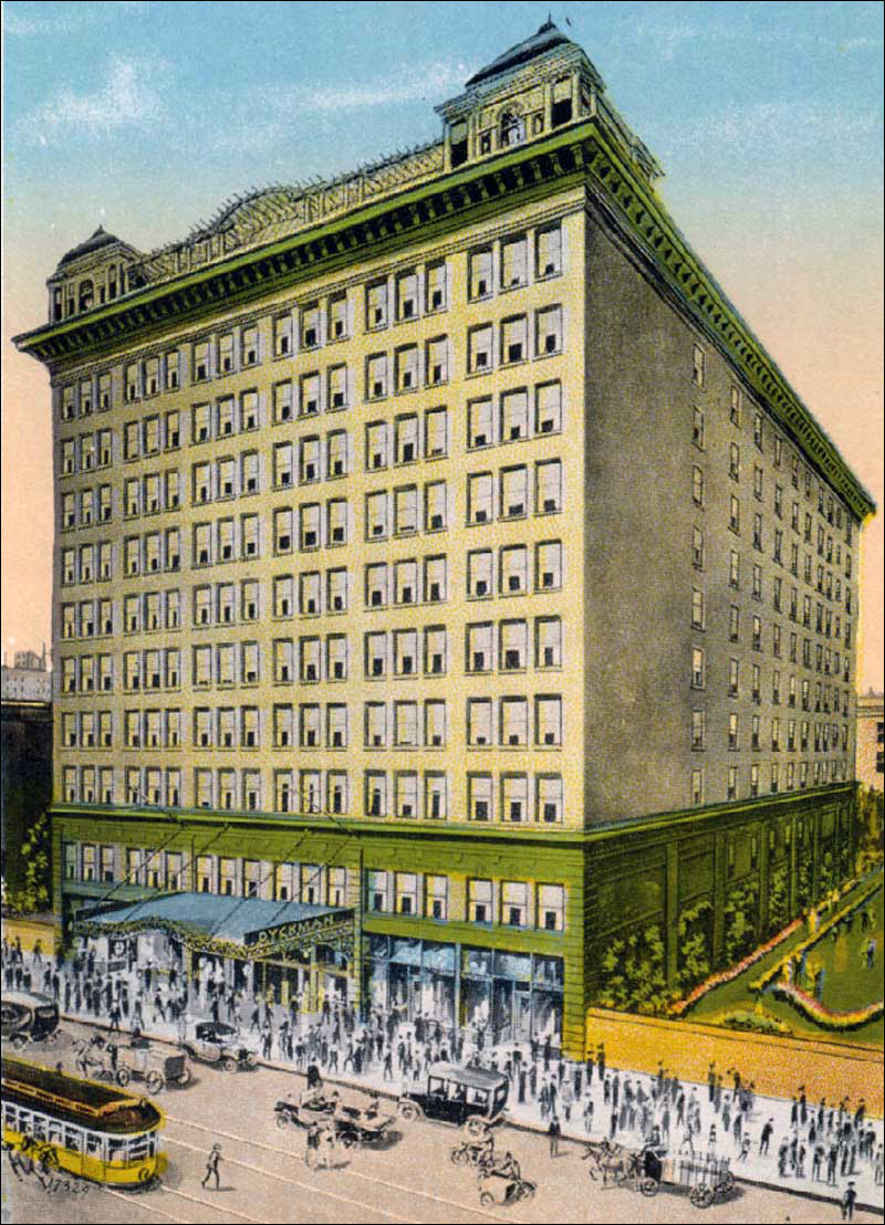 That’s a damned big green hotel, isn’t it? But it didn’t look like that. The Dyckman, as far as I can tell, never had a rooftop garden. It was not flanked by open lots planted with sinuous shrubbery, walled off to bar the hoi polloi. People and vehicles were not translucent, and the hotel itself did not stare down at the streets with a thousand hungry eyes, waiting for more souls to enter its portal and experience the terrors that laid beyond the revolving doors.
