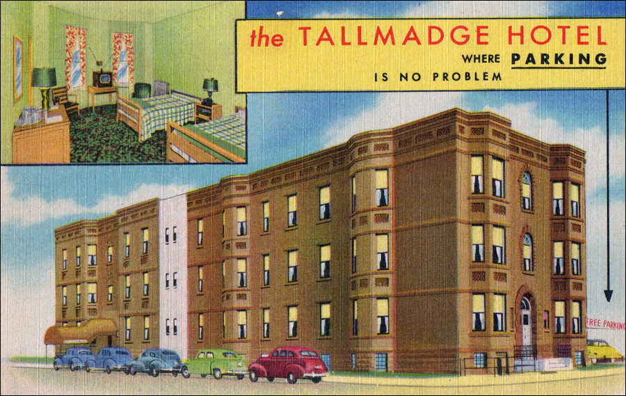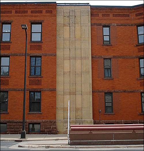 See the light-colored band? It was a later addition, and I don't know what it's for. Perhaps an elevator was added. Perhaps it patched old fire damage. If you stroll forward you'll see how they didn't even try to match anything - different color stone, with moderne styling.
