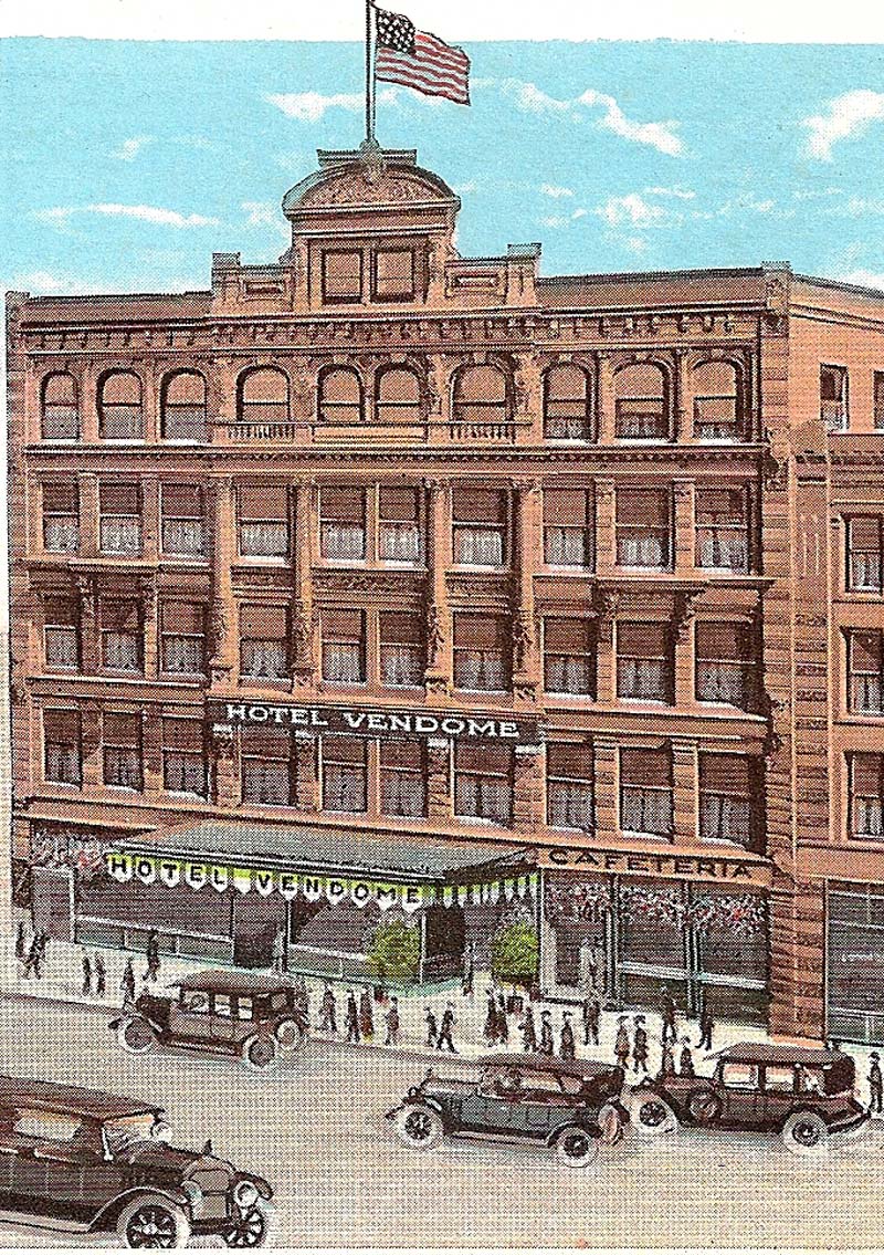 Let’s begin with the usual Postcard Full of Lies. The Vendome did look like this, except for the obligatory drawn-on flag. It was also taller than this – it looks squished down, but also too big – compare the people on the sidewalk to the GIANT CARS and the windows of the hotel, and you have to wonder if some plague of malnutrition had brought the median height down.