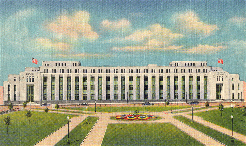 Even when America built fascistic buildings, they still had the human touch. This is the main Post Office for Minneapolis, and it's one of the more handsome 1930s buildings downtown. It's also one of the only ones, but even in a crowded field it would win: it has a stolid, solemn presence that advertises the broad-shouldered virtues of the distant Federal gods; it has enough surface decoration to entice the pedestrian, and its exterior is a golden temple for the postal customer.